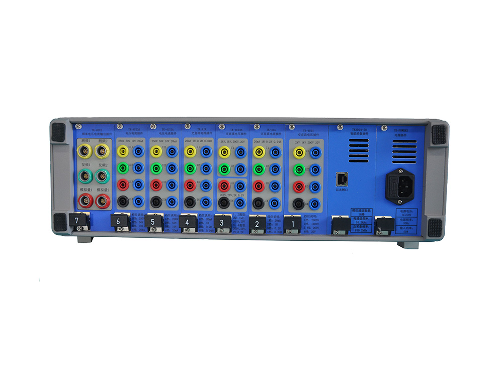 TK5100系列便攜式電量(波形)記錄分析儀是在TK5000系列的基礎(chǔ)上集成融合了發(fā)頻、硬件測(cè)頻及模擬量輸出功能,是一款通用型高性極好電力系統(tǒng)仿真測(cè)試及數(shù)據(jù)記錄分析儀器,包含TK5124、TK5120、TK5116、TK5112等多個(gè)型號(hào),全系列產(chǎn)品均采用分體式鋁合金機(jī)箱,使用時(shí)需與筆記本電腦及配套的TK2.0版監(jiān)控分析軟件配合使用。儀器既可以單獨(dú)通過以太網(wǎng)與電腦配合使用,并可以多臺(tái)儀器并聯(lián)使用,并聯(lián)使用保證各臺(tái)儀器同步采集。TK5100全系標(biāo)準(zhǔn)配置2路頻率輸出通道、2路硬件測(cè)頻輸入通道、兩路模擬量信號(hào)輸出通道及若干具有程控8量程的高性能TK5-4xxx模擬信號(hào)輸入處理插件。發(fā)頻、測(cè)頻通道的誤差都小于0.002Hz,模擬量輸出信號(hào)精度為0.1級(jí),所有模擬輸入通道都具有獨(dú)立程控的8個(gè)量程,綜合采集精度全部為0.1級(jí)(誤差小于0.1%FS+0.05%RD)。